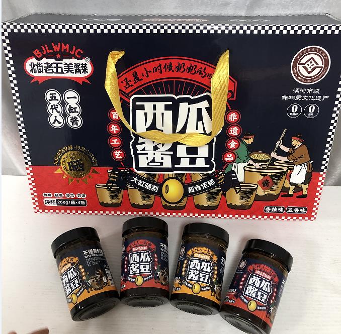 品名:北街老五美酱豆普通礼盒 产品规格:1040g 260g/瓶×4瓶